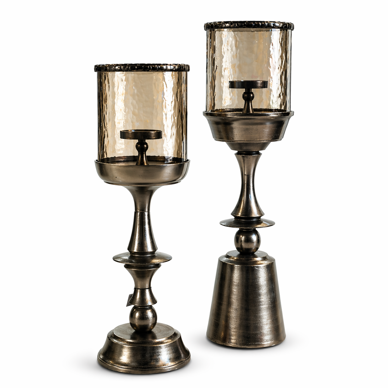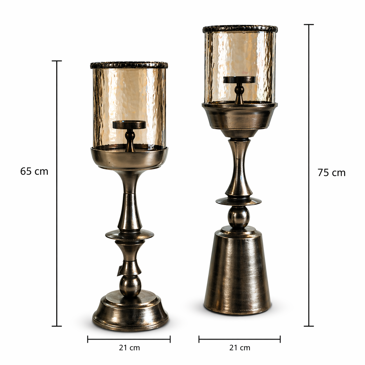 Büyük boy ve küçük boy şamdanın uyumlu formu sayesinde salon, antre, otel dekorasyonu, davet alanı, düğün organizasyonu, nişan masası, vitrin düzenlemesi ve özel gün süslemelerinde estetik bir tamamlayıcı olarak kullanılabilir. Bronz camlı üst kısmı mum ışığını yumuşatarak ortama sıcak ve sofistike bir ambiyans katar.