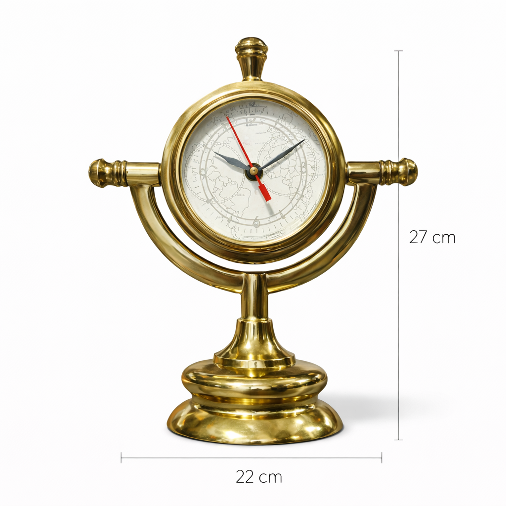 Pirinç tonlu gövdesi, klasik denizci ekipmanlarını çağrıştırırken kırmızı saniye ibresi tasarıma dinamik bir vurgu katar. Ofislerde, kütüphanelerde ve karakter sahibi mekânlarda güçlü bir dekoratif odak noktası oluşturur.