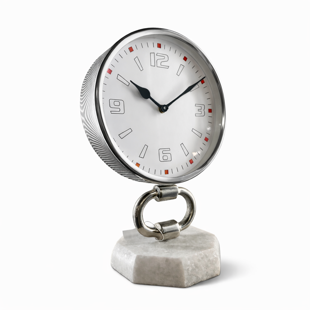 Bu modern mermer tabanlı masa saati, minimalist tasarım anlayışıyla üretilmiş şık ve dekoratif bir saat modelidir. Metal gövdesi, halka formundaki bağlantı detayı ve doğal mermer tabanı sayesinde bulunduğu ortama modern, zarif ve prestijli bir görünüm kazandırır.