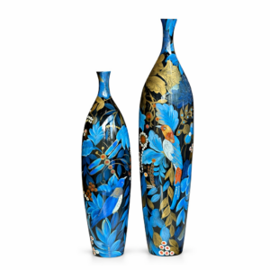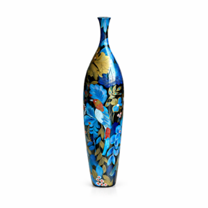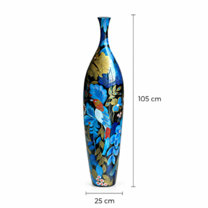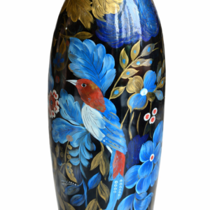 Üzerindeki kuş, çiçek ve yaprak motifleri usta eller tarafından özenle işlenmiş olup her desen canlı renk tonları ve ince fırça darbeleriyle hayat bulmuştur. Mavi, altın ve kırmızı tonlarının kusursuz uyumu ürüne lüks ve dikkat çekici bir görünüm kazandırır. El çizimi desenlerdeki detay seviyesi, bu özel parçayı sıradan dekor ürünlerinden ayırarak benzersiz hale getirir.