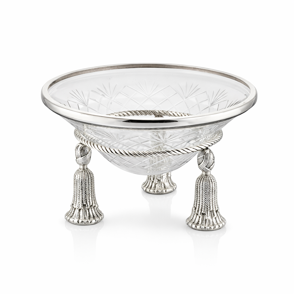 Bu lüks pirinç ayaklı dekoratif kase, zarif tasarımı ve detaylı işçiliği ile yaşam alanlarınıza sofistike bir dokunuş katar. Desenli kristal cam kase, püskül formunda gümüş ayaklar ve halat detaylı kenar tasarımı sayesinde klasik Avrupa dekorasyonundan ilham alan şık bir merkez dekoru oluşturur. Yemek masası, sehpa veya konsol üzerinde meyve kasesi, dekoratif obje veya sunum kasesi olarak kullanılabilir.