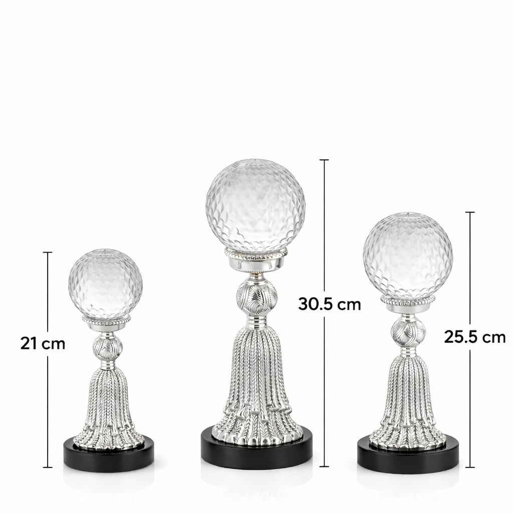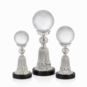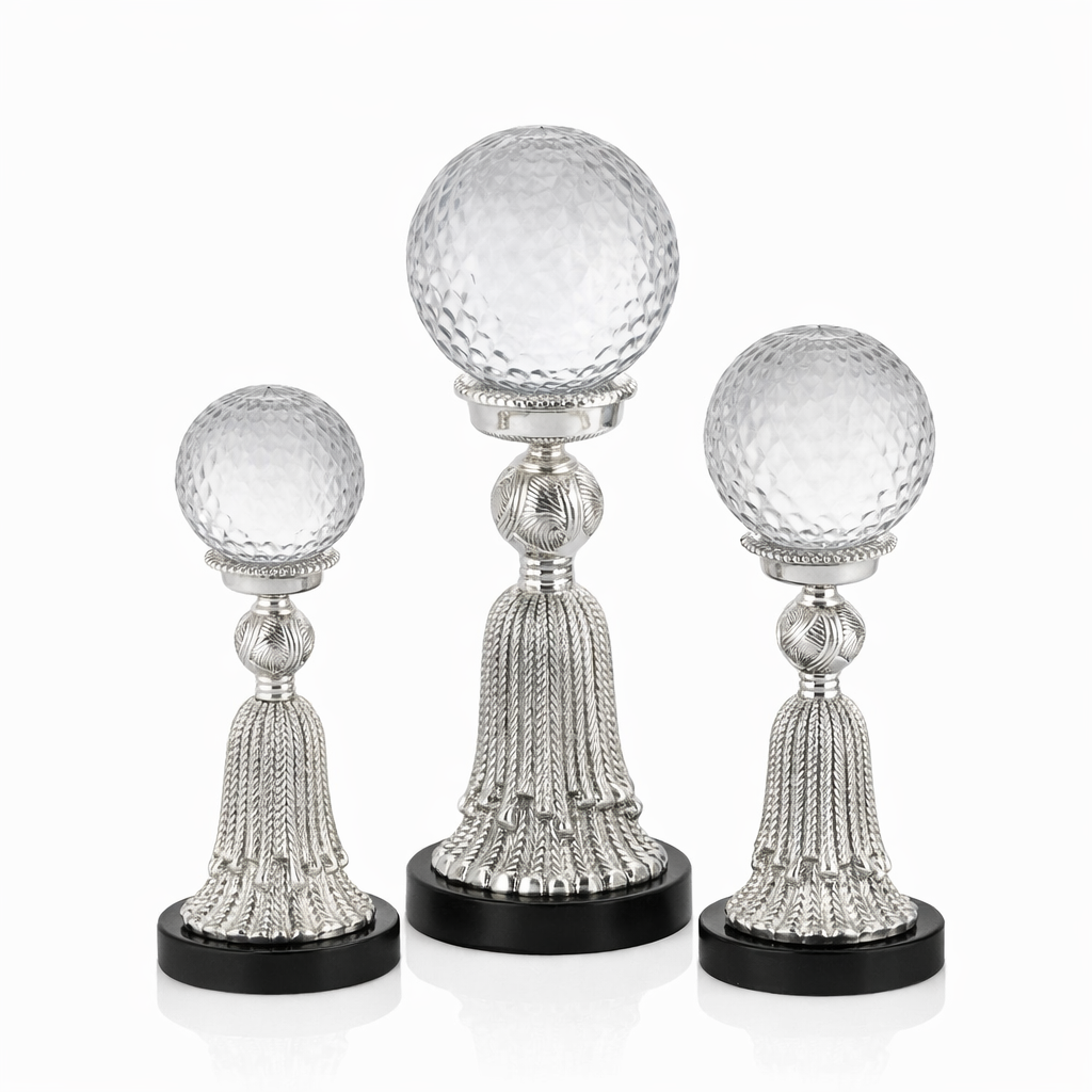Kristal cam küre dekoratif obje seti, zarif gümüş detaylı tabanı ve dokulu cam küresi ile yaşam alanlarınıza şıklık katar. Avrupa klasik dekorasyonu ve Art Deco estetiğinden ilham alan bu üçlü dekor seti; salon, yemek masası, konsol, giriş alanı veya vitrin dekorasyonu için dikkat çekici bir odak noktası oluşturur. Parlak kristal cam küreler ışığı yansıtarak mekâna sofistike ve zarif bir atmosfer kazandırır.