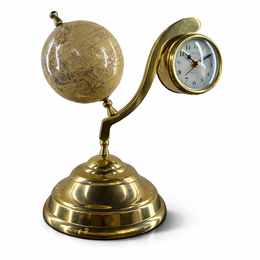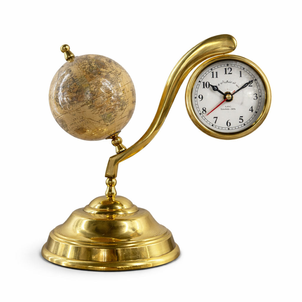 Şık pirinç gövdesi, dekoratif dünya küresi ve klasik saat tasarımı sayesinde bu ürün hem dekoratif bir obje hem de işlevsel bir masa saati olarak kullanılabilir.