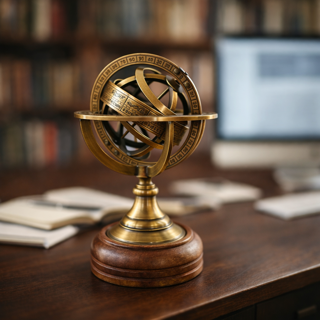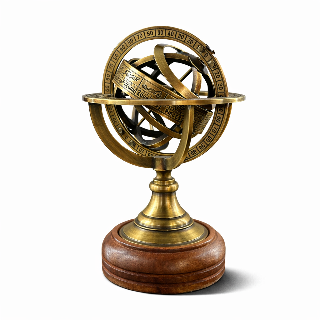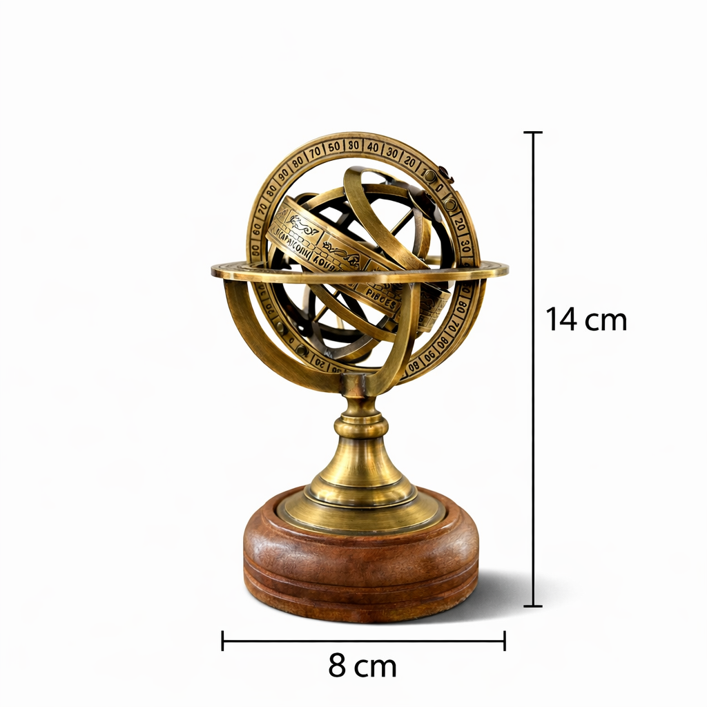 AstroNavigator Pirinç Armillary Sphere, antik astronomi aletlerinden ilham alan zarif bir dekoratif obje ve masa aksesuarıdır. Burç sembolleri ve göksel koordinatlarla işlenmiş döner halkaları sayesinde hem bilimsel bir model hem de sanatsal bir dekor ürünü olarak öne çıkar. Pirinç metal gövdesi ve doğal ahşap tabanı ile vintage ve klasik dekorasyon stillerine mükemmel uyum sağlar.