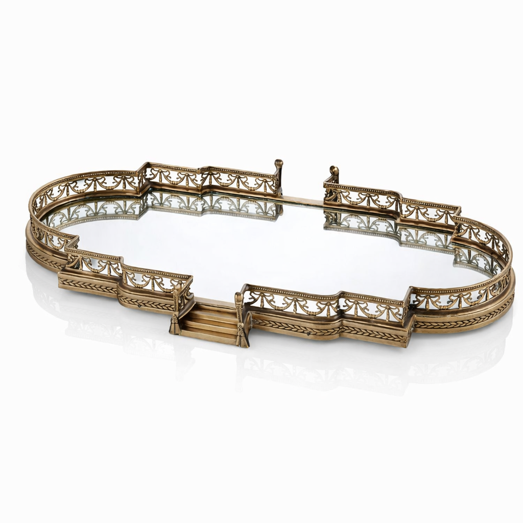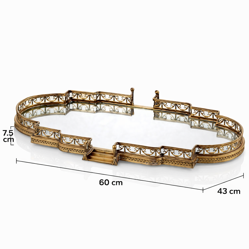 Bu pirinç jardinyer tepsi, klasik Avrupa Viktorya ve neoklasik dekorasyon tarzlarından ilham alan zarif bir dekoratif üründür. Etrafını saran detaylı pirinç korkuluk tasarımı ve aynali tabanı sayesinde çiçek aranjmanları, mumlar, parfümler veya dekoratif objeler için şık bir sergileme alanı oluşturur. Aynalı yüzeyi ışığı yansıtarak dekorasyona derinlik ve lüks bir görünüm kazandırır. Serinin diğer parçaları ile şık kombinasyonlar oluşturur