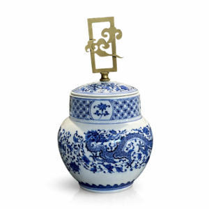 Pirinç döküm kuş figürlü kapaklı mavi beyaz porselen ginger jar, klasik Çin porselen sanatından ilham alan zarif bir dekoratif objedir. Beyaz porselen üzerinde kobalt mavi çiçek desenleri ve kapağındaki altın kuş figürü, ürüne hem sanatsal hem de lüks bir görünüm kazandırır. Chinoiserie stilini yansıtan bu dekoratif kavanoz, salon, konsol, vitrin veya raf dekorasyonu için mükemmel bir seçimdir.