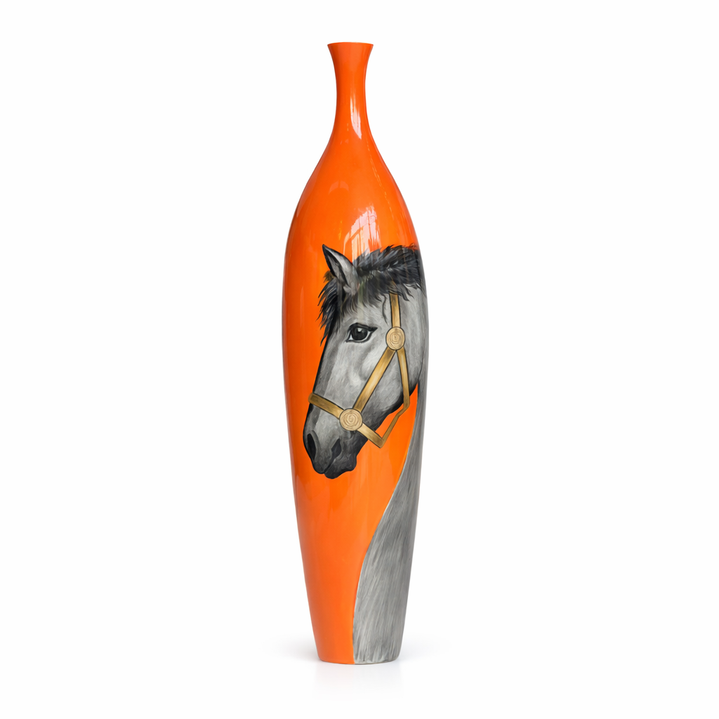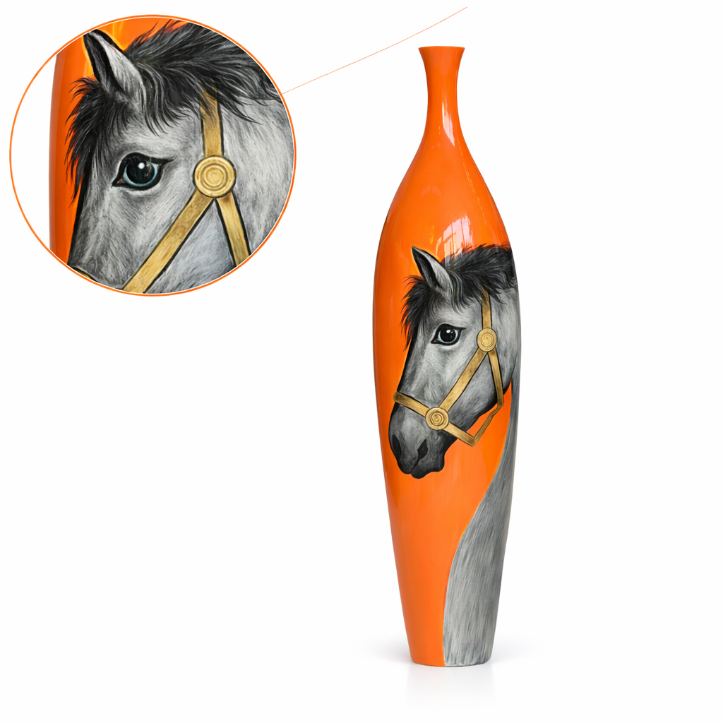 Üzerindeki asil at portresi, usta sanatçılar tarafından ince fırça darbeleriyle özenle elde çizilmiştir. Atın bakışındaki canlı ifade, tüy dokusundaki gerçekçilik, gölgelendirme detayları ve zarif çizgiler esere adeta hayat verir. Turuncu zemin üzerine işlenen gri ve altın tonları, ürüne modern, enerjik ve lüks bir görünüm kazandırır. Desenlerdeki detay seviyesi ve sanat kalitesi bu özel parçayı benzersiz hale getirir.