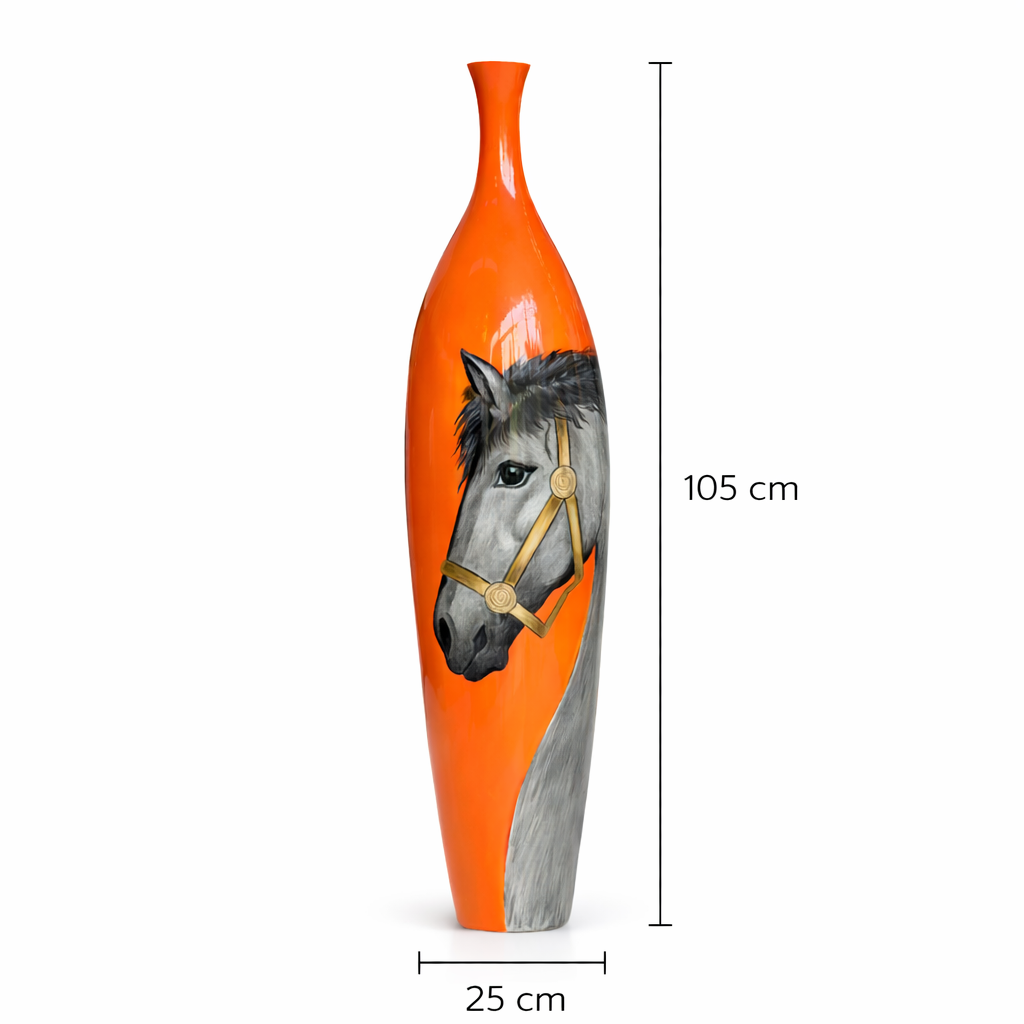 Etkileyici boyutu ve sanatsal tasarımıyla öne çıkan bu el çizimi at figürlü porselen yer küpü, yaşam alanlarına güçlü ve zarif bir karakter kazandırır. Büyük boy formu sayesinde salon, antre, ofis, otel lobisi ve geniş dekorasyon alanlarında dikkat çekici bir odak noktası oluşturur.