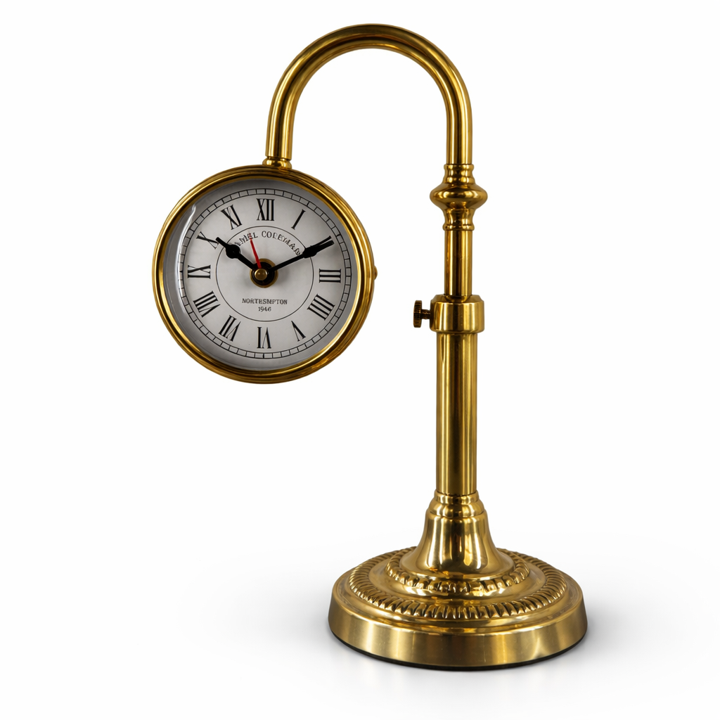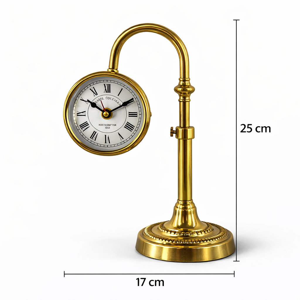 Bu vintage pirinç askılı masa saati, klasik tren istasyonu saatlerinden ilham alınarak tasarlanmıştır. Askılı yuvarlak saat formu ve zarif kavisli standı sayesinde hem nostaljik hem de şık bir masa dekoru oluşturur.