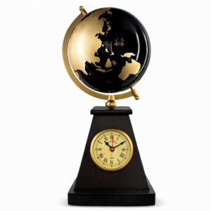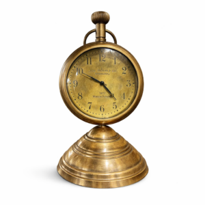 Bu model, metal gövdesi, çift ayaklı dengeli yapısı ve otomatik dönen numara mekanizması ile hem dekoratif hem de işlevsel bir masa saatidir.