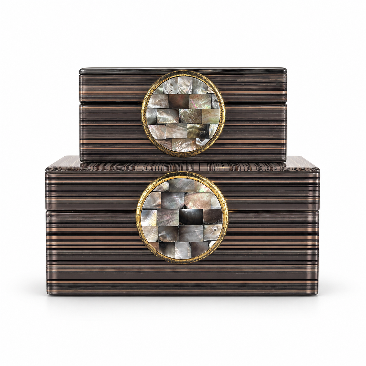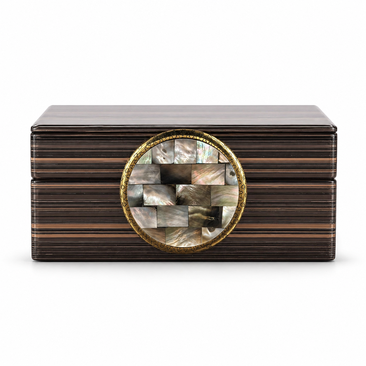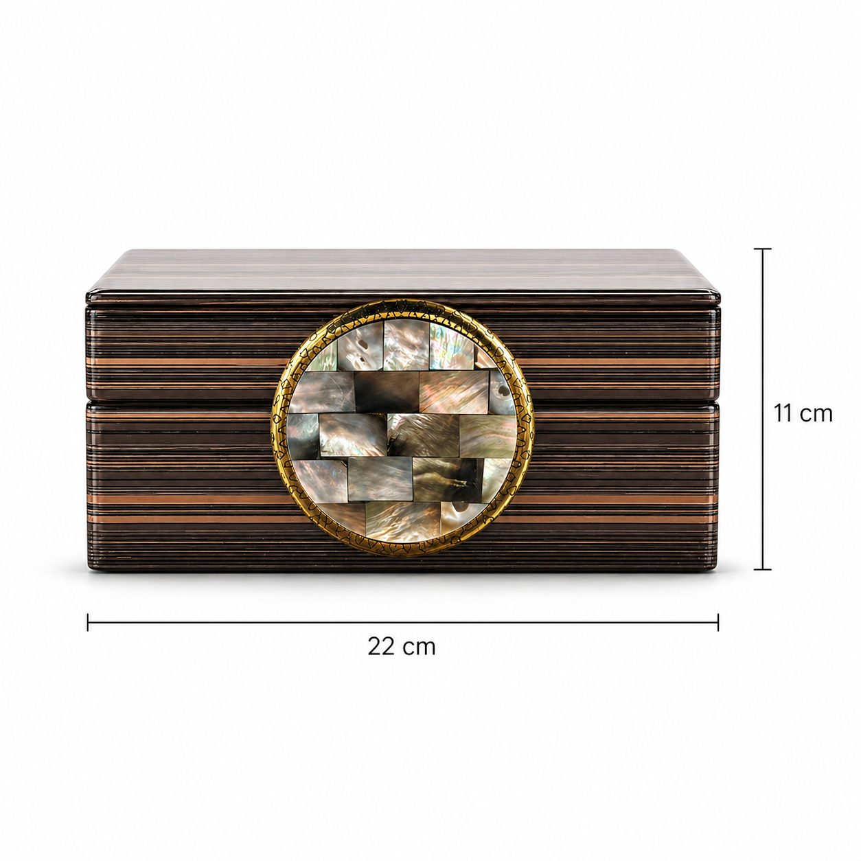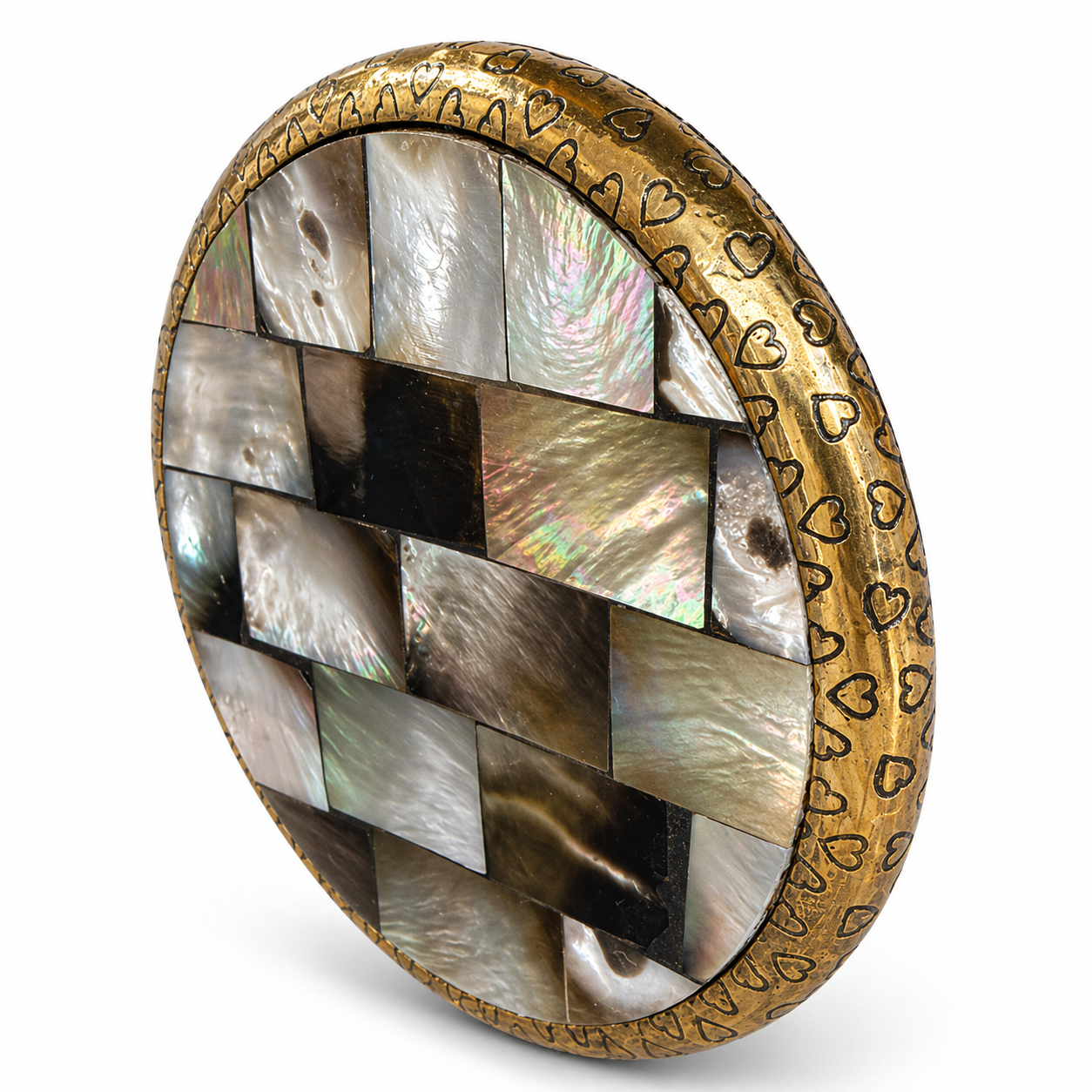 Ön tarafında bulunan yuvarlak arma, doğal sedefli kemikten üretilmiştir. Armanın yüzeyindeki özel desenler ürüne benzersiz ve lüks bir görünüm kazandırırken, kenarlarında yer alan minik kalp süslemeler tasarıma zarif bir dokunuş ekler. El işçiliğini yansıtan bu detaylar sayesinde ürün dekorasyonda dikkat çekici bir tamamlayıcı haline gelir.