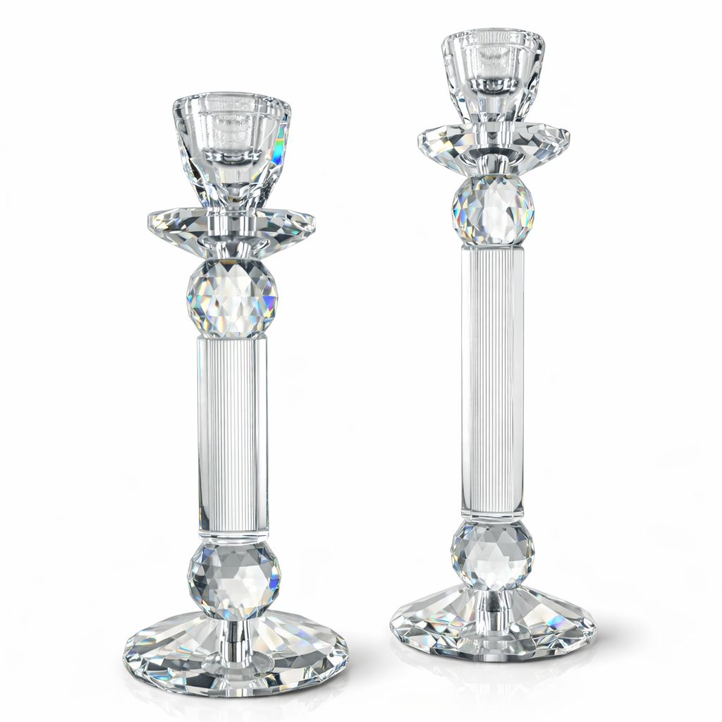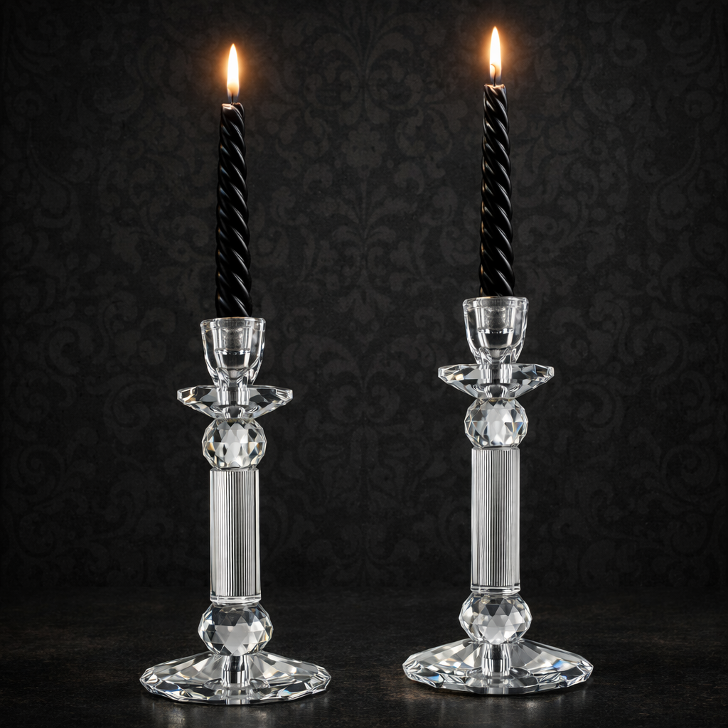 Her bir şamdan; fasetli kristal küre, prizma kesimli taban ve dikey çizgili gövde detayları ile ışığın cam yüzeyde kırılmasını sağlar. Mum ışığıyla birlikte kristal yüzeyler gökkuşağı yansımaları ve parlak ışık efektleri oluşturur.