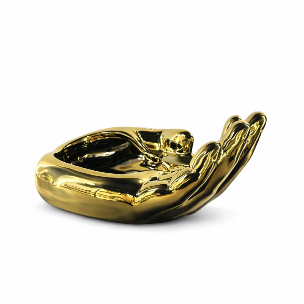 Yüzeyindeki pürüzsüz seramik dokusu, parlak altın kaplama görünümü ve detaylı hatları ürüne lüks bir karakter kazandırır. El formundaki ince işçilik ve kıvrımlı tasarım çizgileri, sıradan dekor ürünlerinden ayrılarak bulunduğu ortamda dikkat çekici bir odak noktası oluşturur.