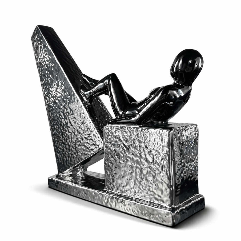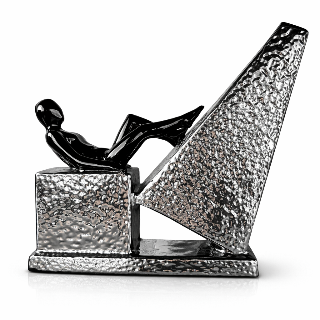 Bu Modern Soyut İnsan Figürlü Heykel, çağdaş sanat estetiğini yansıtan dikkat çekici bir dekoratif objedir. Geometrik mimari form ile birleşen uzanmış insan figürü, modern sanat galerilerini andıran güçlü ve özgün bir tasarım ortaya çıkarır.