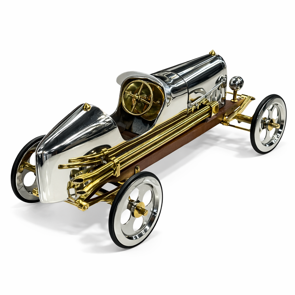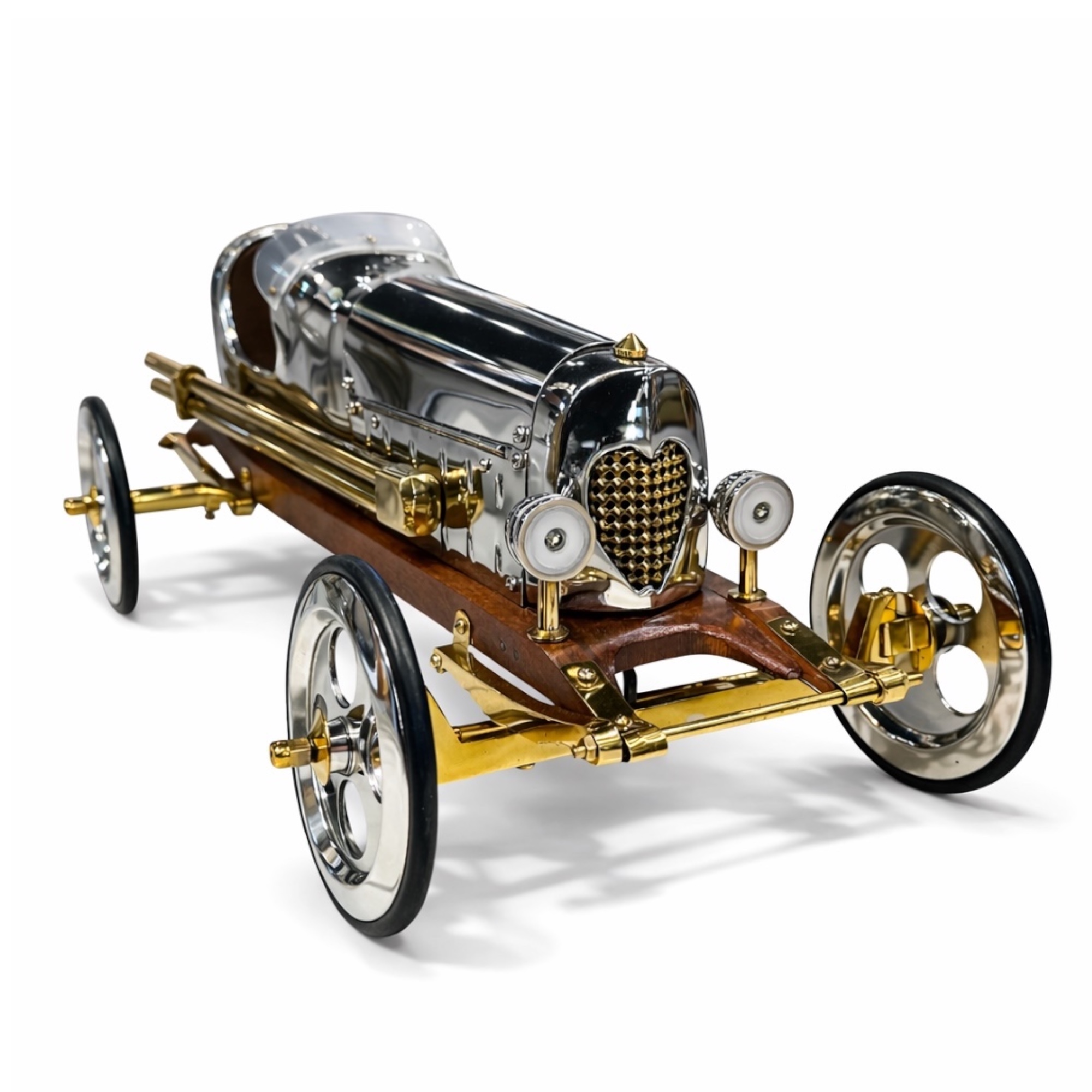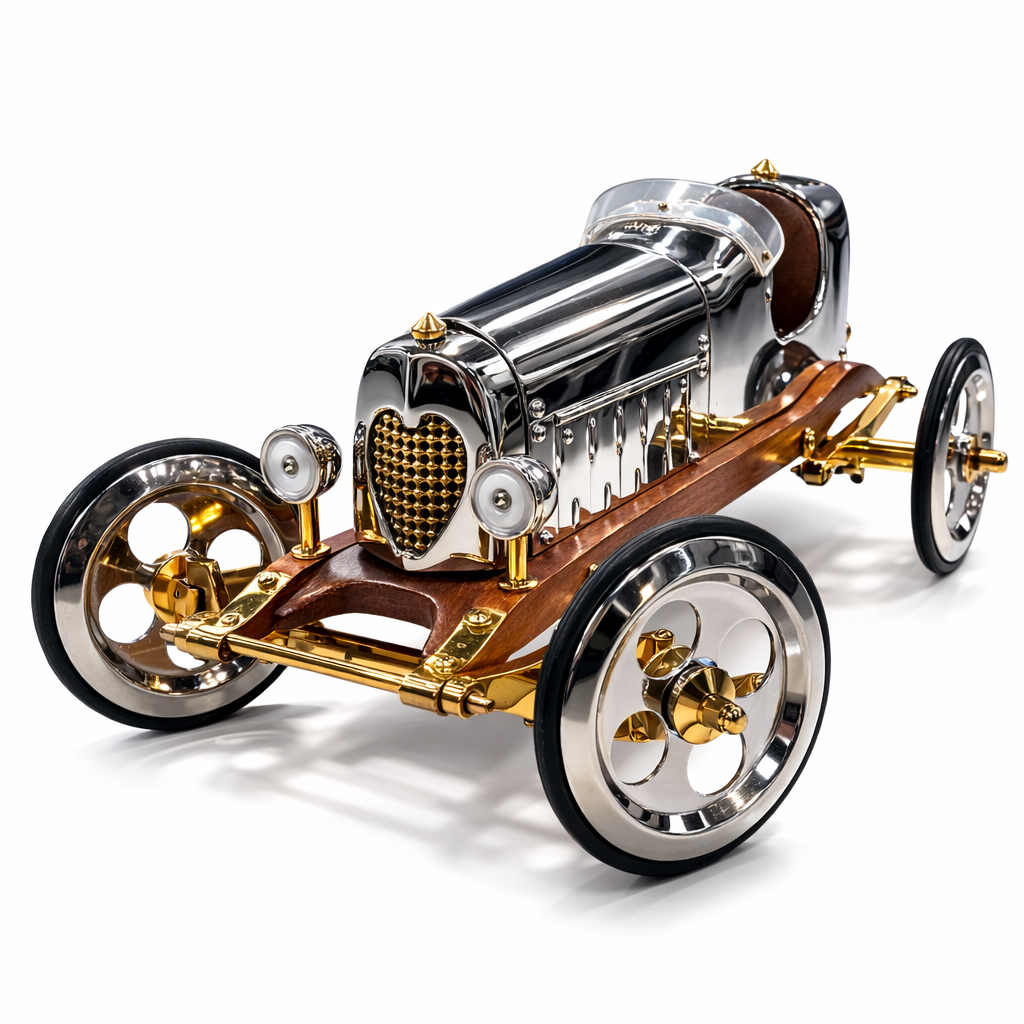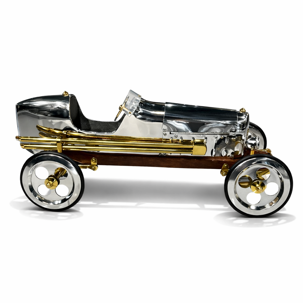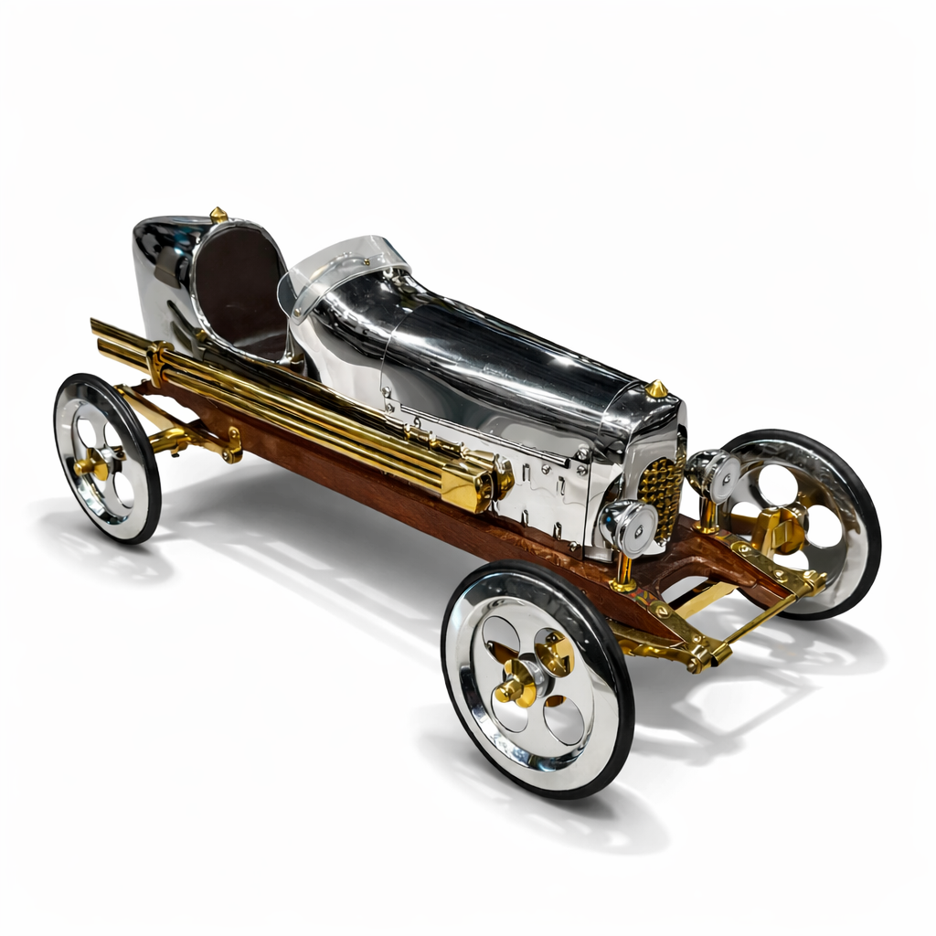 Bu vintage Grand Prix yarış arabası dekoratif model, klasik motorsporlarının altın çağından ilham alan şık ve koleksiyonluk bir tasarımdır. Parlak metal gövde, pirinç detaylı egzoz boruları ve ahşap şasi tabanı, erken dönem Avrupa yarış arabalarının mühendislik estetiğini yansıtır. Bu dekoratif model, ofis masaları, kitaplıklar, vitrinler veya otomobil temalı dekorasyonlar için dikkat çekici bir koleksiyon parçasıdır.