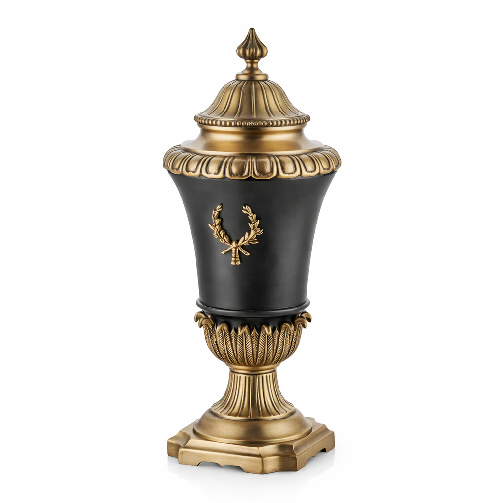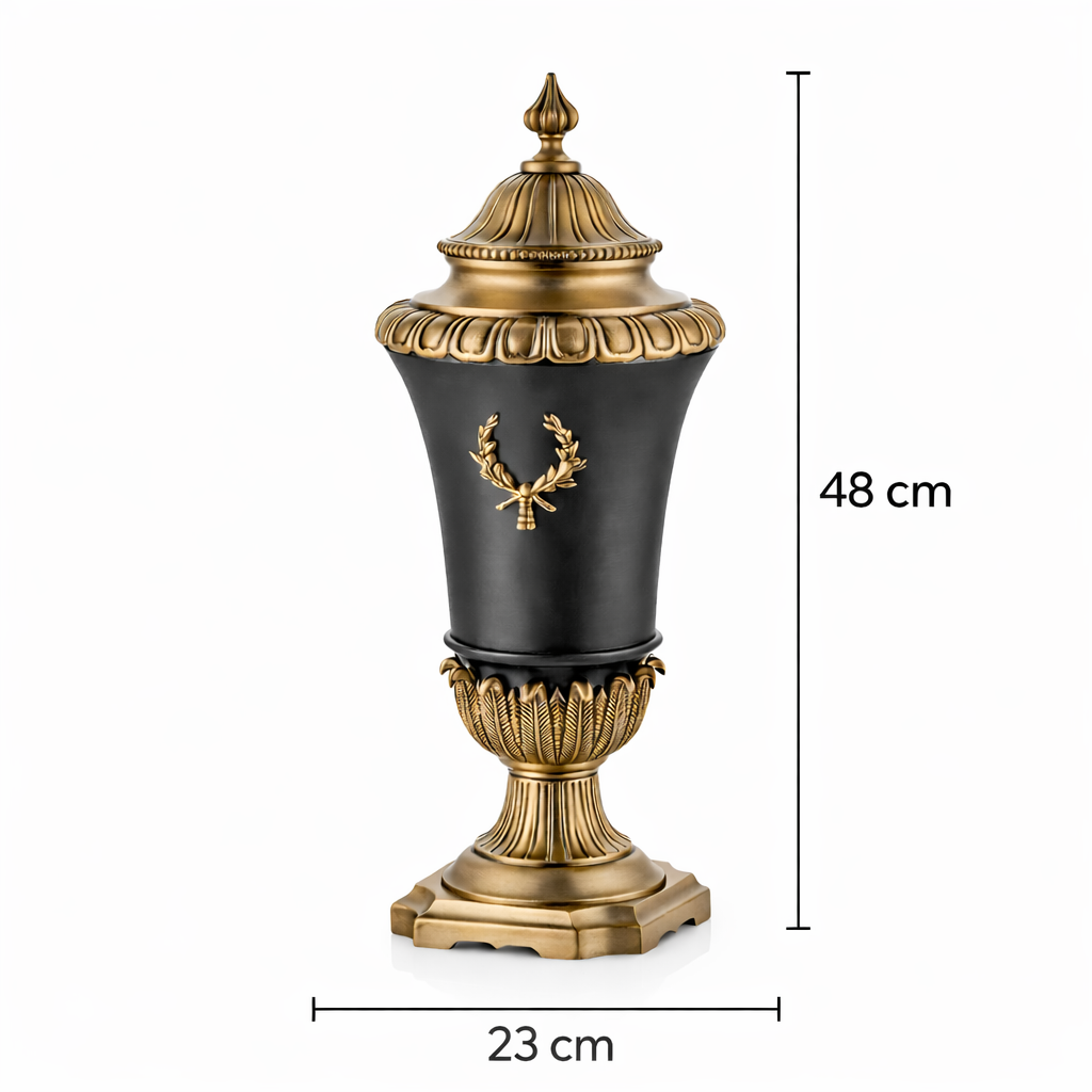 Bu 48 cm yüksekliğinde saf pirinç dekoratif vazo, klasik ve lüks dekorasyonlar için tasarlanmış gösterişli bir üründür. Tamamen ağır ve kaliteli pirinçten üretilmiş olan bu urna formundaki vazo, siyah ve altın renk kombinasyonu ile zarif detaylara sahiptir. Ağırlığı ve sağlam yapısı sayesinde hem dayanıklı hem de prestijli bir dekoratif obje olarak dikkat çeker. Konsol, giriş alanı, salon veya vitrin dekorasyonu için güçlü bir dekoratif vurgu oluşturur.