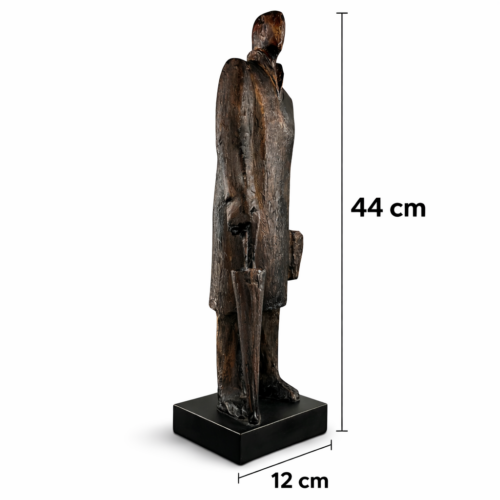 Bu modern şemsiyeli adam heykeli, şehir yaşamının zarafetini ve hareketini sanatsal bir dille yansıtan özgün bir dekoratif objedir. Şemsiye ve çanta taşıyan stilize insan figürü, modern hayatın temposunu ve düşünceli bir karakteri simgeler. Uzatılmış minimalist formu ve bronz görünümlü dokulu yüzeyi sayesinde ofis, kitaplık, konsol veya sehpa üzerinde dikkat çekici bir sanat objesi oluşturur.