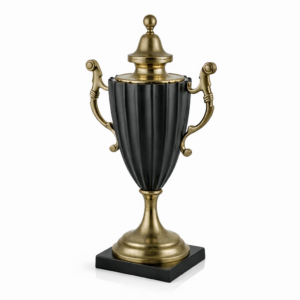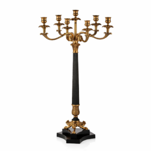 Bu 42 cm yüksekliğinde, tamamen pirinç döküm gövdeye ve mermer tabana sahip şamdan, zamansız tasarımı ve kaliteli malzemeleriyle dekorasyona zarif bir dokunuş katar. Siyah ve altın renk kombinasyonu, yemek masalarında, şömine üzerinde veya klasik iç mekanlarda şık bir atmosfer oluşturur. Sağlam pirinç yapısı ve ağır mermer tabanı sayesinde hem dayanıklı hem de dengeli bir dekoratif üründür.