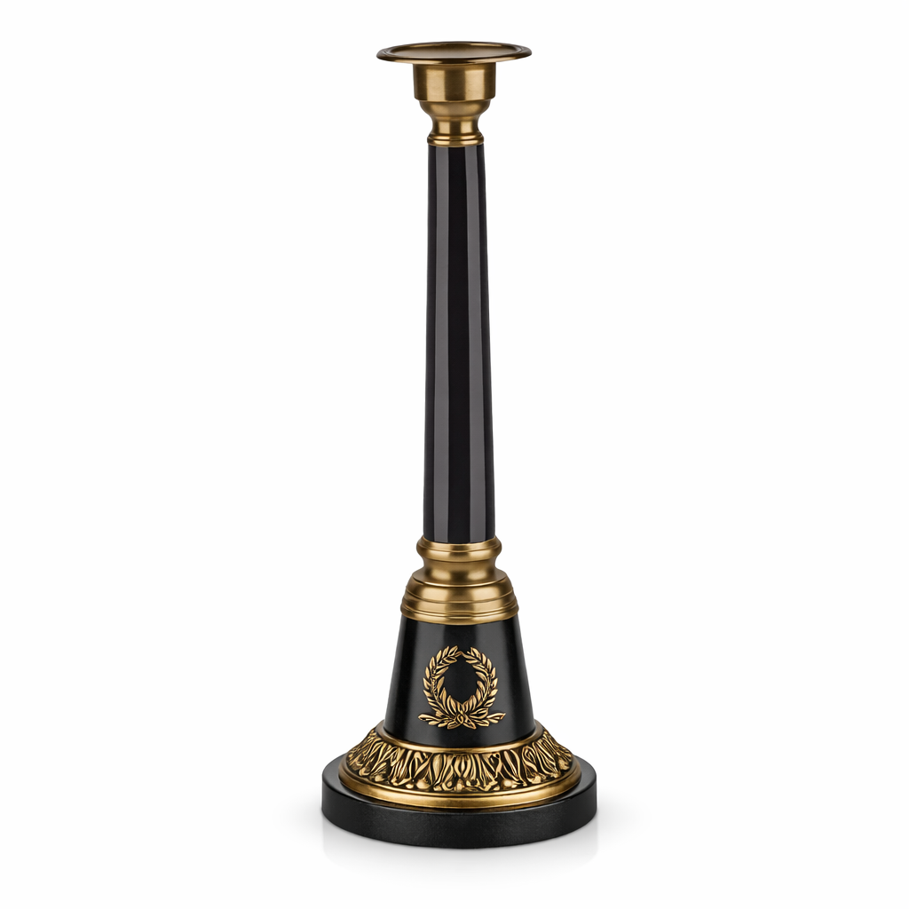 Bu 42 cm yüksekliğinde, tamamen pirinç döküm gövdeye ve mermer tabana sahip şamdan, zamansız tasarımı ve kaliteli malzemeleriyle dekorasyona zarif bir dokunuş katar. Siyah ve altın renk kombinasyonu, yemek masalarında, şömine üzerinde veya klasik iç mekanlarda şık bir atmosfer oluşturur. Sağlam pirinç yapısı ve ağır mermer tabanı sayesinde hem dayanıklı hem de dengeli bir dekoratif üründür.