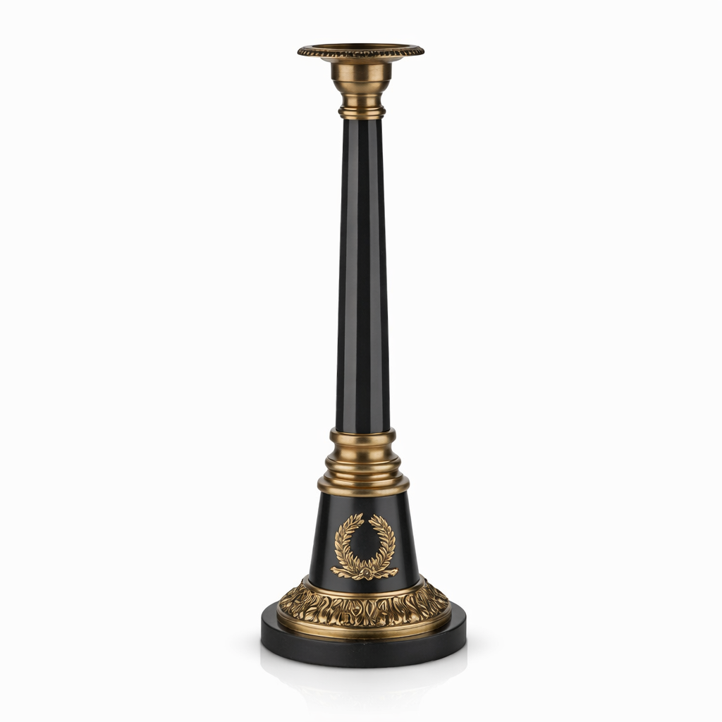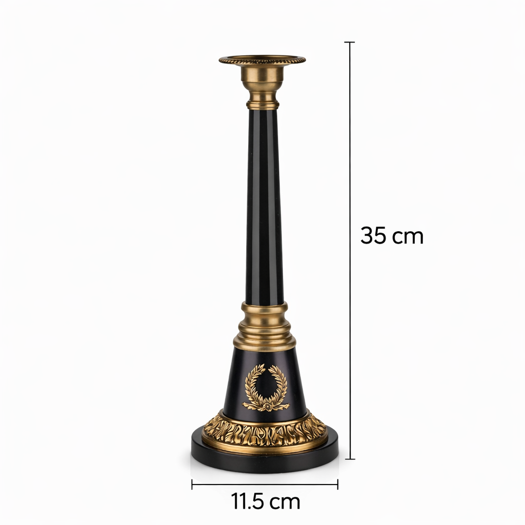 Bu 35 cm yüksekliğinde, tamamen pirinç gövdeye ve mermer tabana sahip şamdan, zamansız tasarımı ve kaliteli malzemeleriyle dekorasyona zarif bir dokunuş katar. Siyah ve altın renk kombinasyonu, yemek masalarında, şömine üzerinde veya klasik iç mekanlarda şık bir atmosfer oluşturur. Sağlam pirinç yapısı ve ağır mermer tabanı sayesinde hem dayanıklı hem de dengeli bir dekoratif üründür.