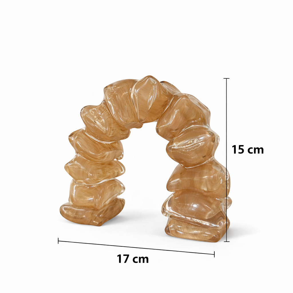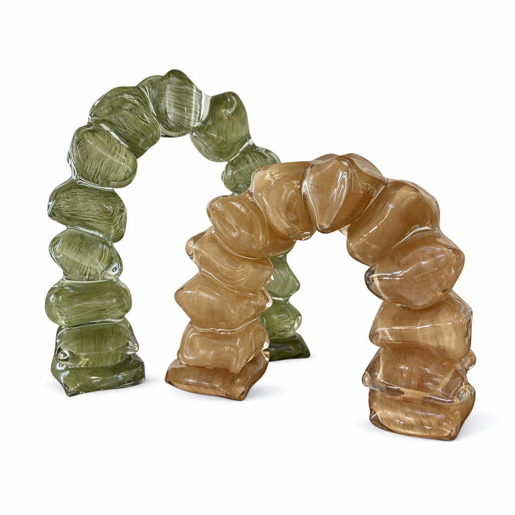 Zeytin-yeşili ton geçişleri, kristalin içindeki damar dokusuyla birleşerek doğal taş hissi yaratır. Her bir segmentin düzensiz formu, tasarıma bilinçli bir asimetri ve hareket kazandırır. Işığı farklı açılarda kıran yüzey, objeyi gün ışığında daha şeffaf, loş ortamda ise daha yoğun ve gizemli gösterir.