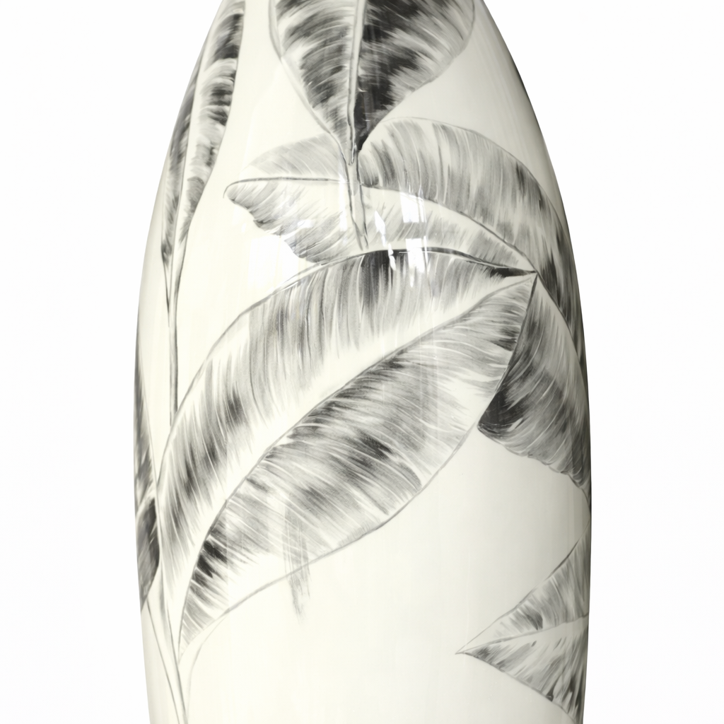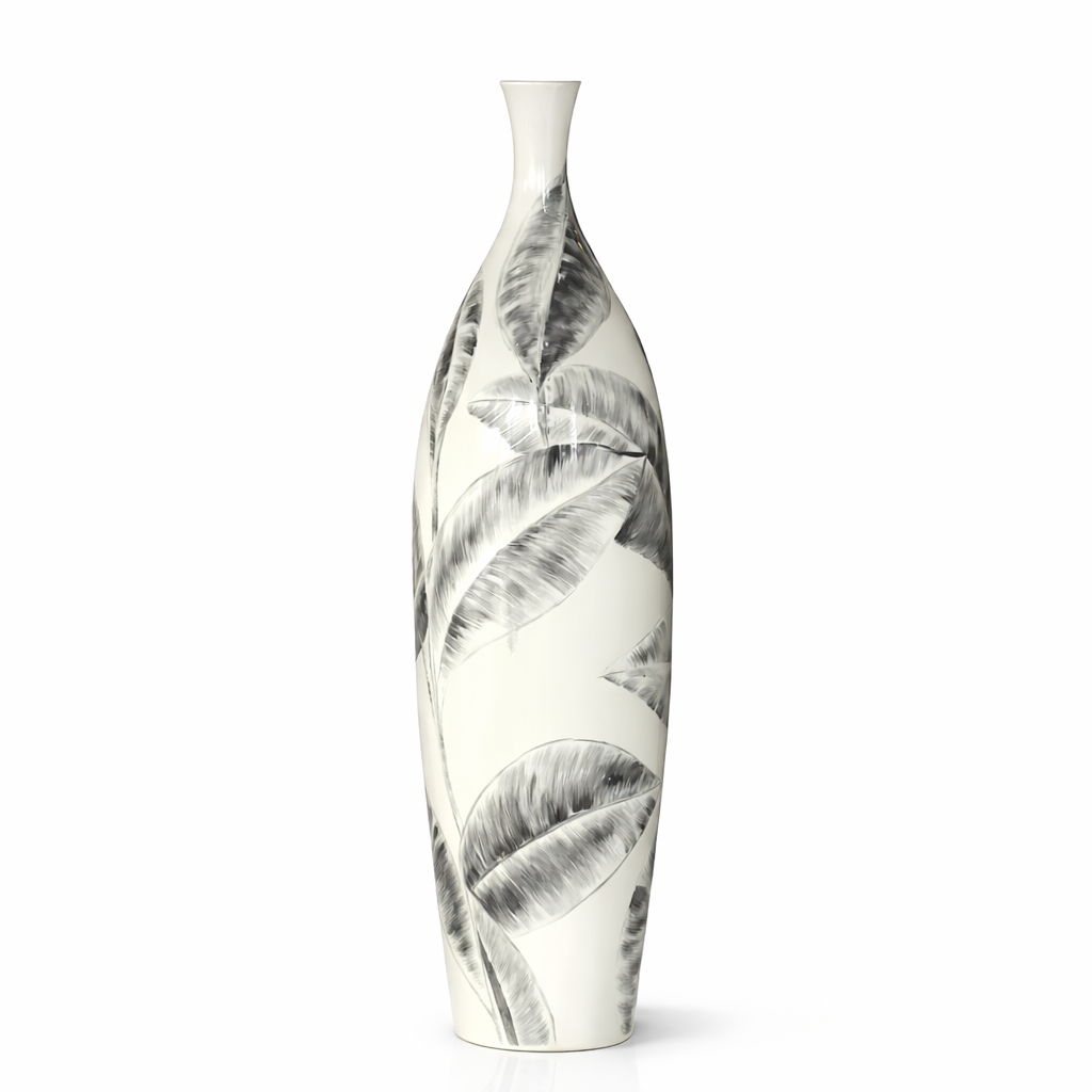 Üzerindeki botanik yaprak desenleri, usta sanatçılar tarafından ince fırça darbeleriyle özenle elde çizilmiştir. Yaprak damarlarındaki detaylar, doğal gölgelendirmeler ve hareket hissi veren çizgiler ürüne canlı ve estetik bir görünüm kazandırır. Siyah-beyaz tonların dengeli uyumu sayesinde sade ama güçlü bir tasarım etkisi yaratır. Her bir yaprak motifi doğadan ilham alınarak işlendiği için ürün sanatsal bir karakter taşır.