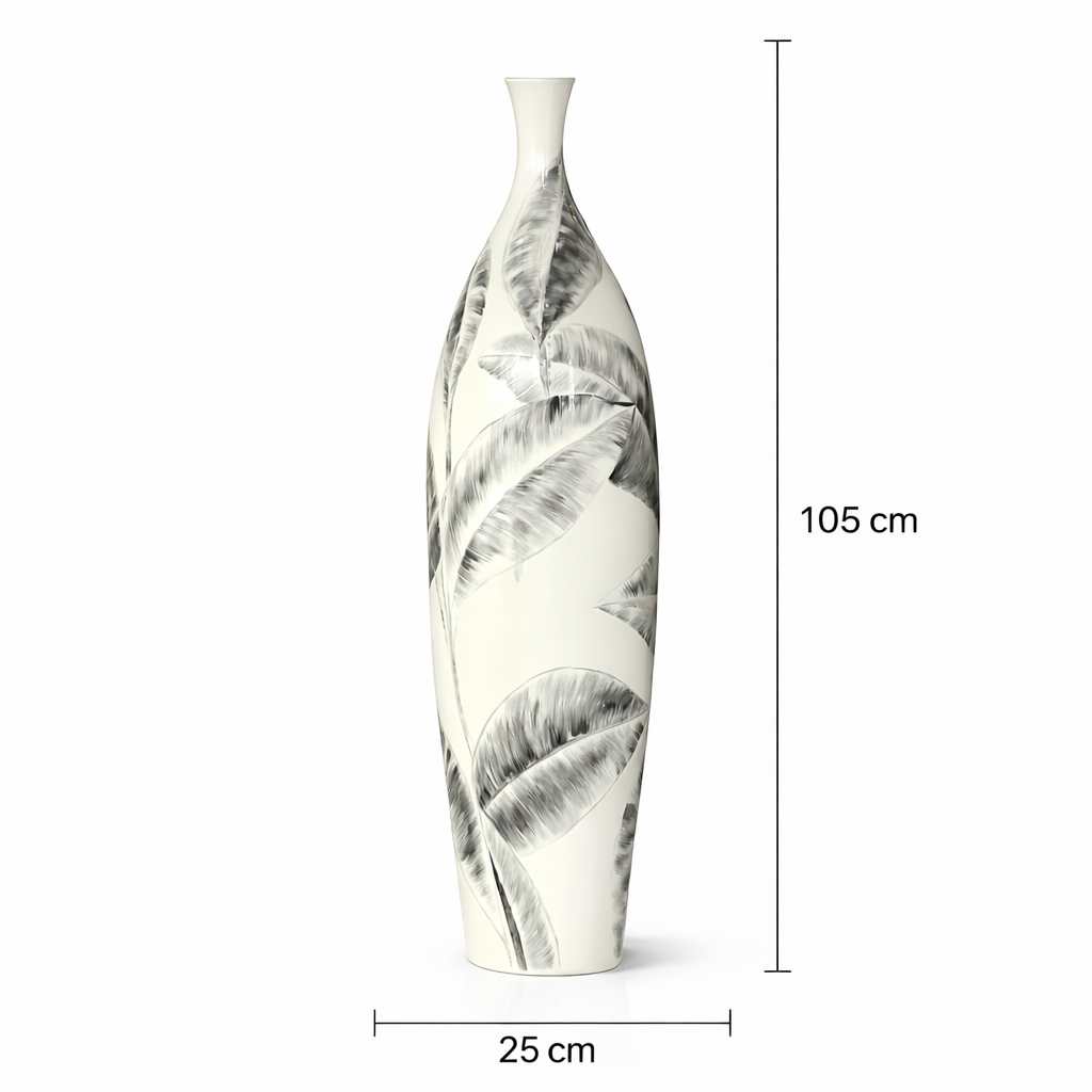 Zarif tasarımı ve sanatsal dokunuşlarıyla öne çıkan bu el çizimi porselen yer küpü, yaşam alanlarına sade ama etkileyici bir şıklık kazandırmak isteyenler için özel olarak tasarlanmıştır. İnce uzun formu, modern hatları ve doğal yaprak desenleri sayesinde salon, antre, yatak odası, ofis ve geniş dekorasyon alanlarında göz alıcı bir tamamlayıcı olarak öne çıkar.