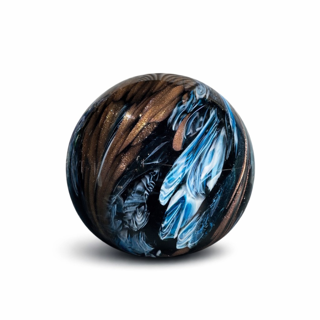 Derin siyah camın içinde dolaşan turkuaz akışlar ve bakır tonlu dokular, geceyle ışığın buluştuğu bir anı yansıtır. Her açıdan farklı bir yoğunluk sunan yüzeyi, ışıkla temas ettiğinde canlı bir hareket hissi oluşturur.