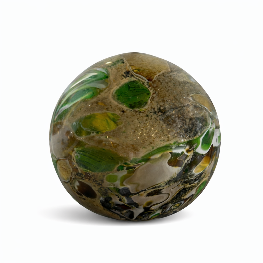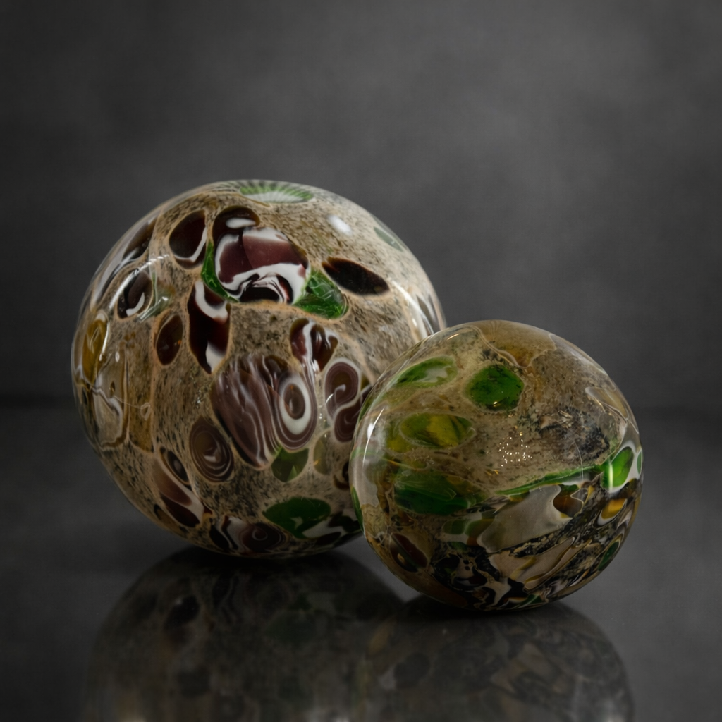 Ünlü İtalyan Murano cam sanatından ilham alan tasarımı, amber, bordo, yeşil ve krem tonlarının cam içerisinde sanatsal şekilde birleşmesiyle benzersiz bir görünüm sunar. Her parça kendine özgü desenlere sahip olduğu için koleksiyonluk ve özgün bir dekoratif obje niteliğindedir.