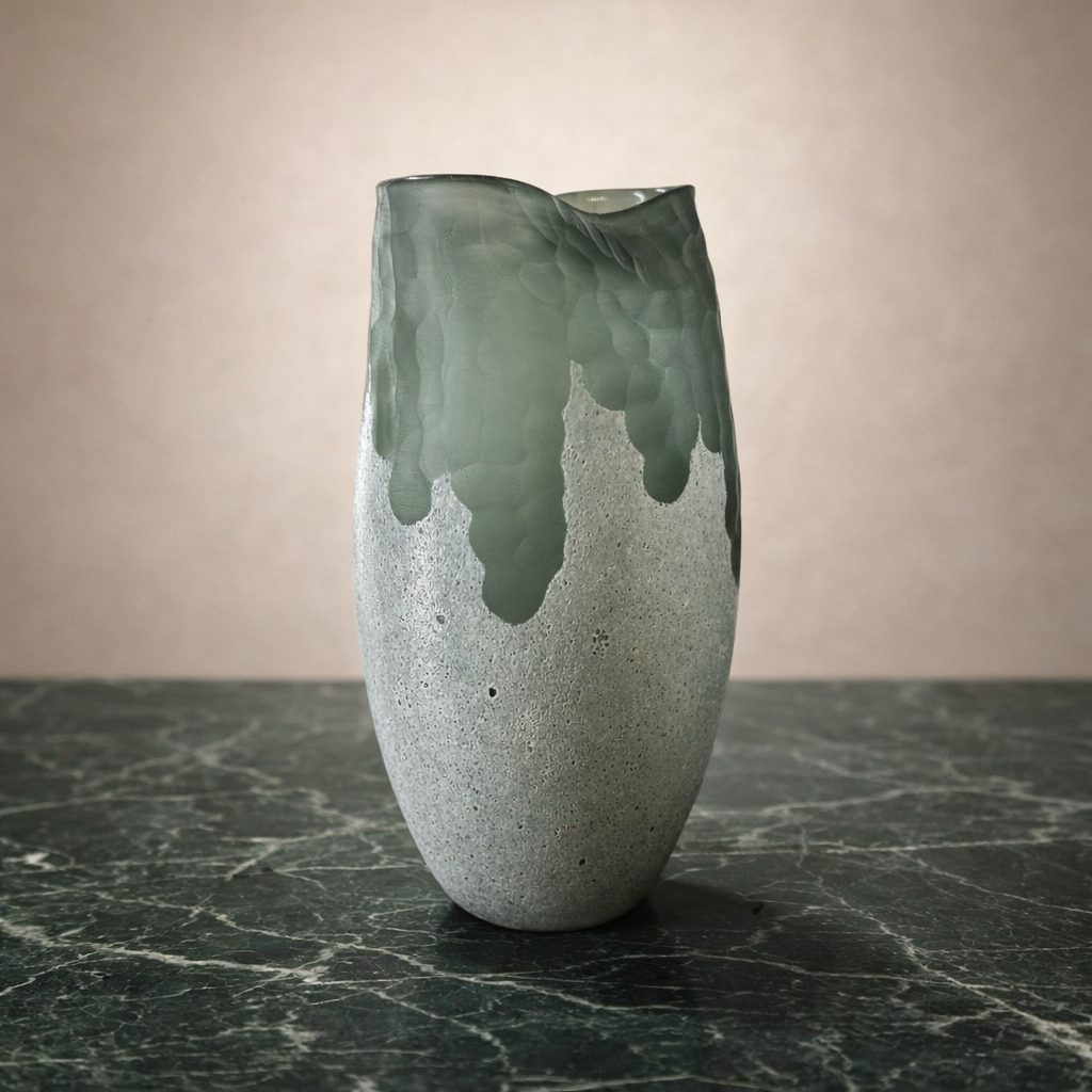 Bu zarif yeşil sanat cam vazo ile yaşam alanınıza doğal ve sofistike bir dokunuş katın. Özgün dokulu yüzeyi ve akışkan organik formu ile tasarlanan bu modern dekoratif cam vazo, yumuşak adaçayı yeşili tonları ve katmanlı sanatsal görünümü sayesinde her mekânda dikkat çekici bir odak noktası oluşturur.